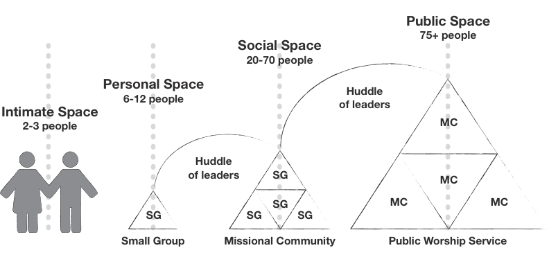 To close, here’s a helpful diagram we often use to help explain this visually. For churches that have all of the 4 sociological spaces at work (Public worship service, Missional Communities and Small Groups), it can often look like this: